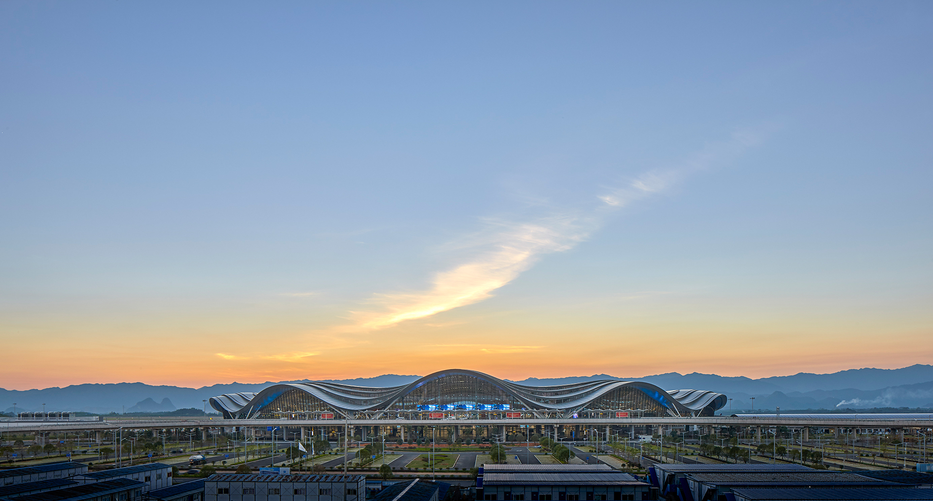 桂林被冠以 “國際性旅游航運(yùn)樞紐”等眾多頭銜,本項(xiàng)目作為廣西壯族自治區(qū)成立70周年重點(diǎn)項(xiàng)目之一,承載了城市新門戶和帶動經(jīng)濟(jì)增長的重大責(zé)任。在用地緊張、容量目標(biāo)壓力巨大、與現(xiàn)狀銜接難題的背景下,采用單一空側(cè)、貫穿式陸側(cè)及新樓與老樓平行式發(fā)展格局,南端開放保留下一期建設(shè)靈活性,北端與T1航站樓在空陸側(cè)進(jìn)行緊密便捷銜接,最大限度節(jié)省用地為遠(yuǎn)期發(fā)展預(yù)留更大靈活性,并為T1與T2航站樓協(xié)同運(yùn)行提供最大便利。