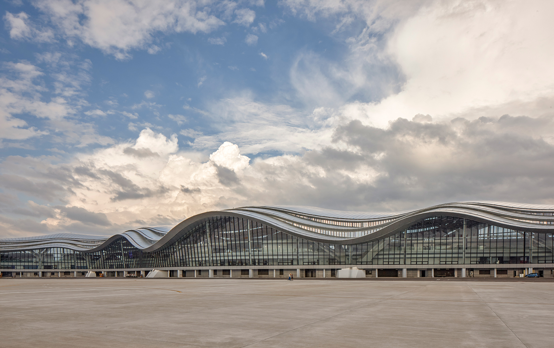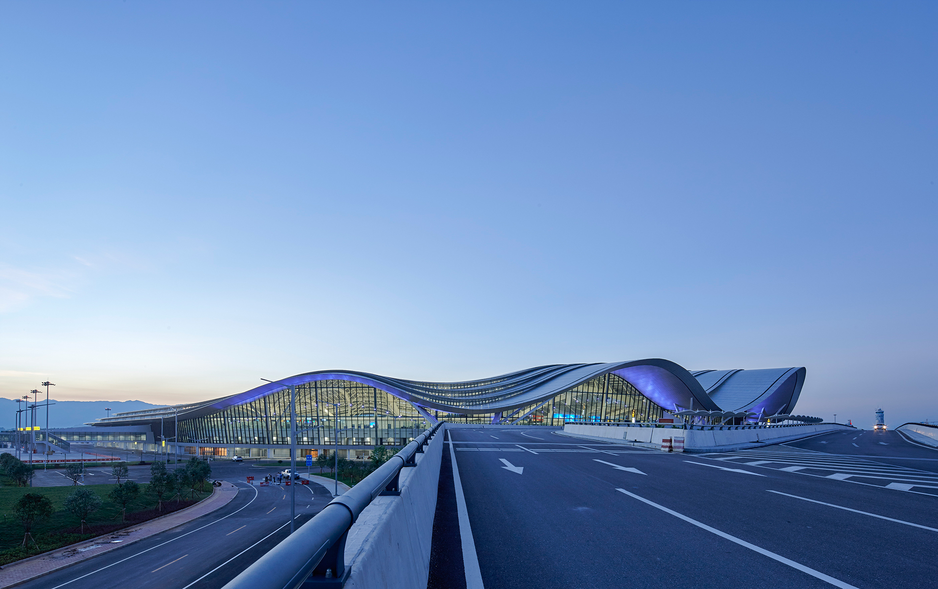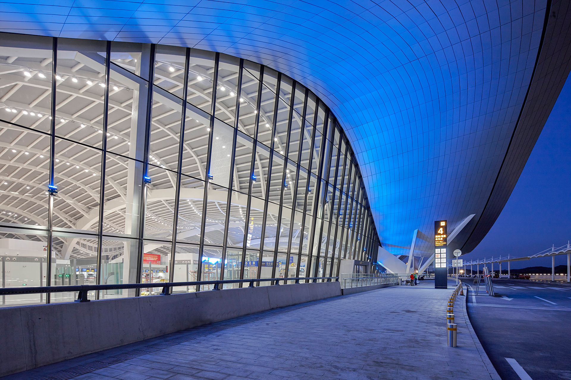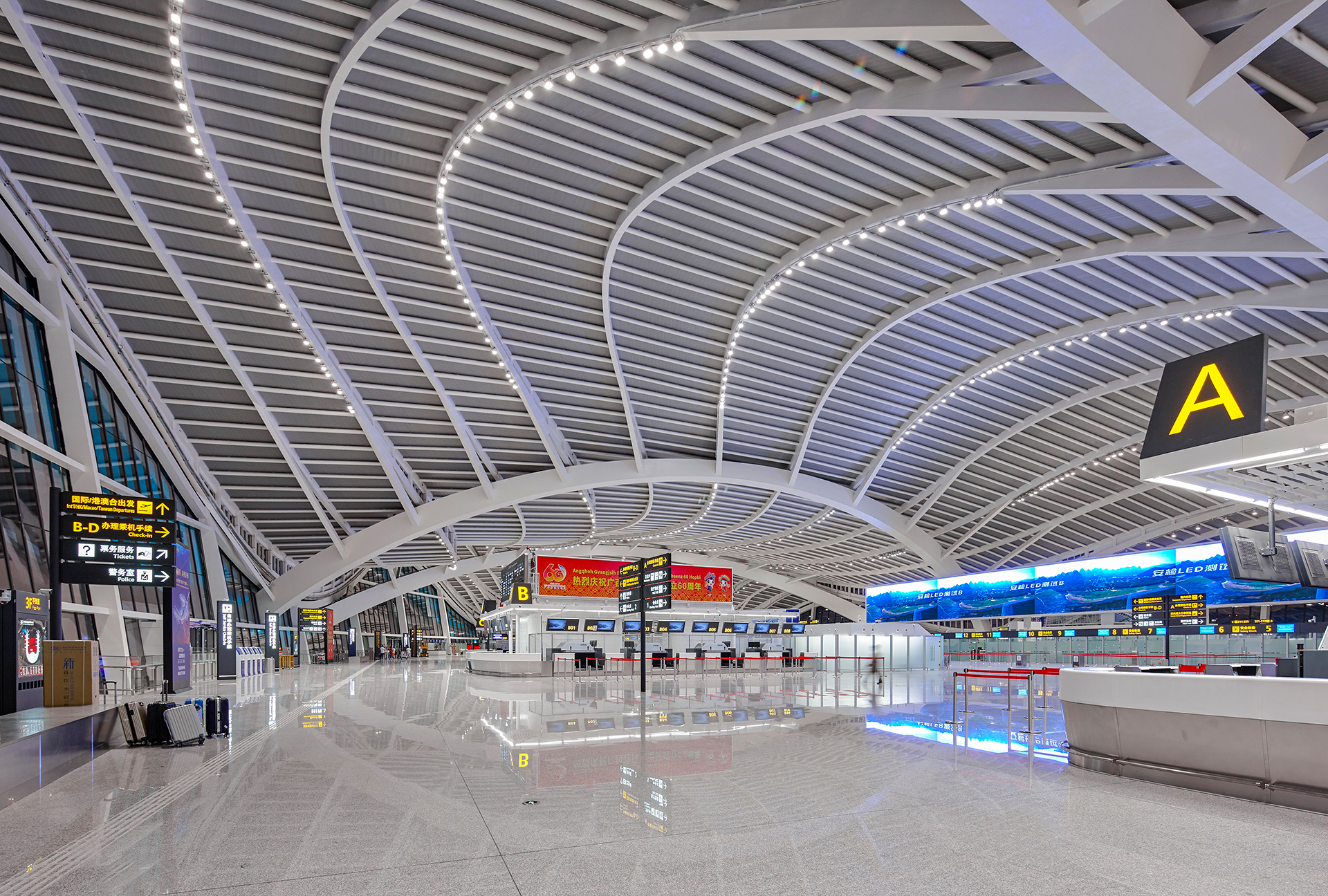 本項(xiàng)目五個連續(xù)起伏的拱形曲面與建筑內(nèi)部空間序列對應(yīng),成對的傾斜拱形支撐實(shí)現(xiàn)整個離港層大跨度的連續(xù)無柱空間。豎向分格的超白玻璃幕墻沿建筑立面展開,首層采用氟碳噴涂鋁單板幕墻。屋頂采用單層拱殼結(jié)構(gòu)以多榀傾斜拱為骨架,,頂部覆蓋金屬屋面系統(tǒng),通過建筑結(jié)構(gòu)一體化設(shè)計,結(jié)構(gòu)構(gòu)件直接成為室內(nèi)裝飾要素。屋面創(chuàng)新采用輕型金屬屋面與卷材防水和金屬裝飾板結(jié)合的屋面構(gòu)造系統(tǒng),實(shí)現(xiàn)了結(jié)構(gòu)底板作為裝飾板、屋面防水與裝飾雙層構(gòu)造等多方面的創(chuàng)新,并申請相關(guān)專利,實(shí)現(xiàn)了良好的防水性能及自然的金屬質(zhì)感和連續(xù)平滑的曲面效果。