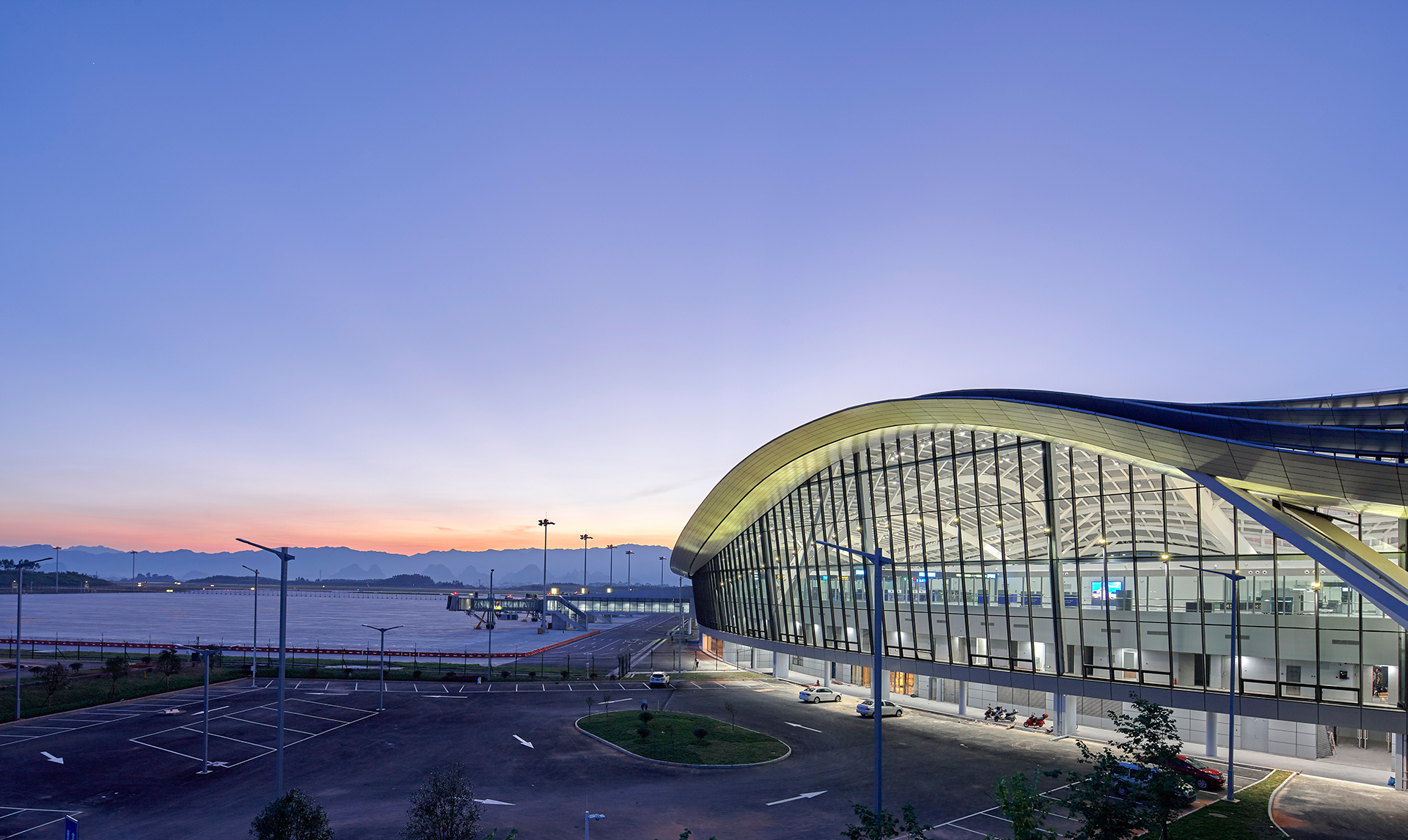 廣西桂林國際機(jī)場T2航站樓,為廣西壯族自治區(qū)面向“一帶一路”的重點(diǎn)建設(shè)項(xiàng)目。航站樓總面積約十萬平米。地上三層,地下設(shè)置一層管廊層。建筑為U字型布局,東西長約353米,南北寬約372米。建成后旅客年吞吐量850萬人次。