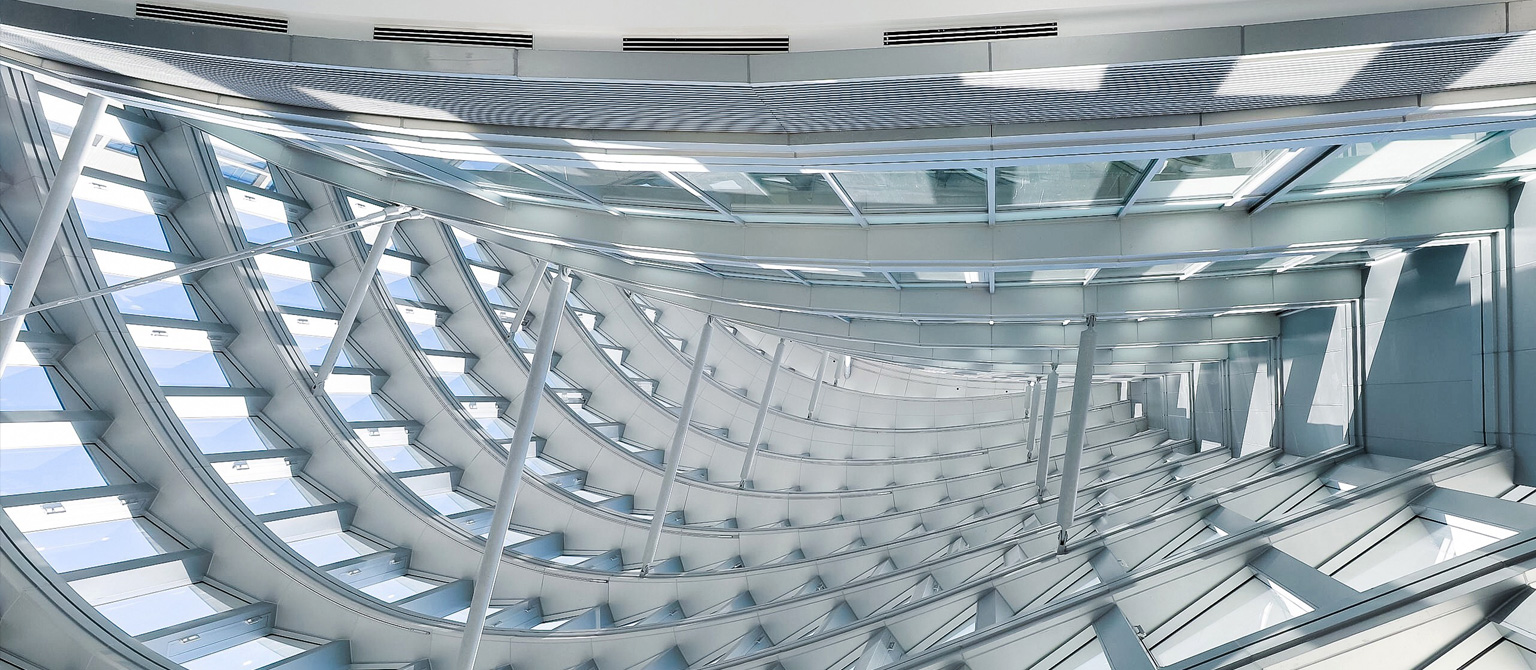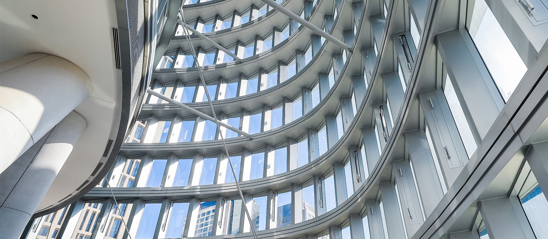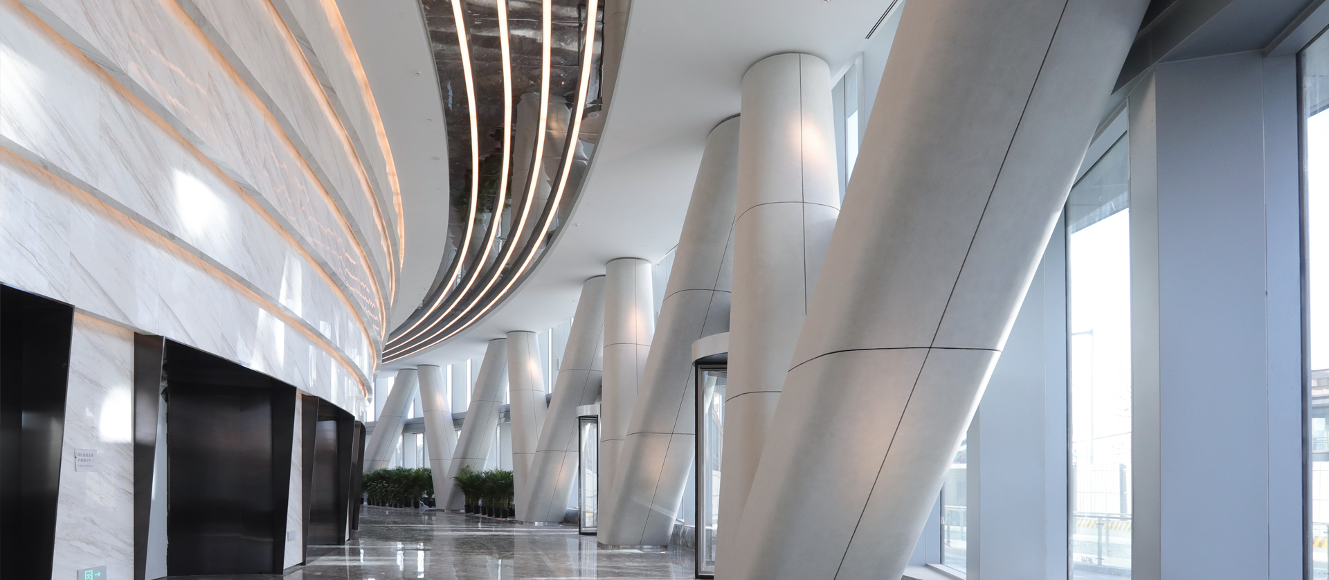 由于位于環(huán)形軸線上的地下柱子已經(jīng)建成,為了實(shí)現(xiàn)與放射軸線控制的地上外幕墻柱的連接,在首二層采用V柱進(jìn)行轉(zhuǎn)換,將地下結(jié)構(gòu)通過極具表現(xiàn)力的手法轉(zhuǎn)換到樓上結(jié)構(gòu),同時符合結(jié)構(gòu)受力特性。屋頂Y柱作為外幕墻柱在穹頂?shù)难由?,同時也具備重要的視覺需求。為了降低截面尺寸,設(shè)計(jì)將其模擬樹形分叉,在頂部收攏到一個圓環(huán)。內(nèi)穹頂結(jié)構(gòu)也沿放射軸線向中心匯聚到核心筒,最終與外穹頂網(wǎng)架聯(lián)系在一起,形成了非常穩(wěn)定的雙層穹頂結(jié)構(gòu)。