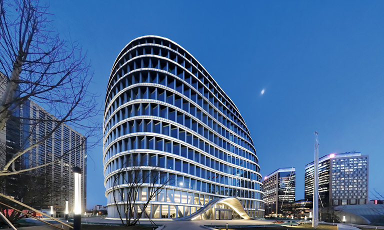 方案取自于花樣滑冰的運(yùn)動軌跡,通過層層流動的軌跡生成動感的建筑形象與中央綠地自由曲線融為一體,同時回應(yīng)了周邊的弧形的城市道路,仿佛明珠一般鑲嵌在場地之中。設(shè)計(jì)采用鋸齒形幕墻單元和蓑衣裝配幕墻來實(shí)現(xiàn)平直構(gòu)件對曲面的擬合。每一層外幕墻通過鋸齒形幕墻單元進(jìn)行排布,形成錯落勻致的肌理。中庭幕墻為了呼應(yīng)外幕墻,同樣采用鋸齒單元幕墻形式,但區(qū)別在于每一個單元均出挑,層間內(nèi)凹,巧妙擬合了層層收緊的內(nèi)穹頂空間。